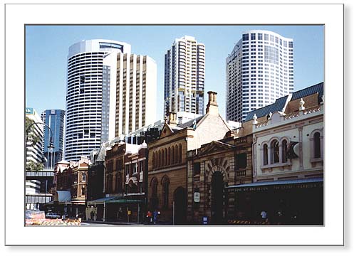 Office towers rise futuristically above early Sydney's historic Rocks area, with the sandstone Victorian buildings that have been preserved.