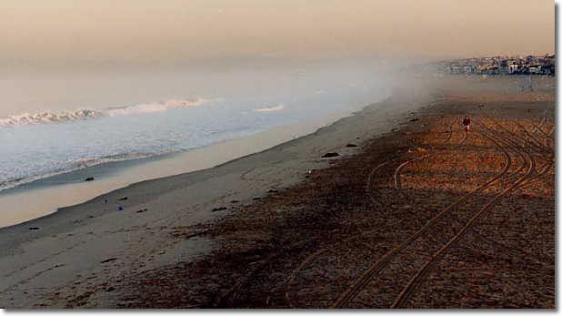 The early rays of the sun give the sand a reddish hue, and the mists rise from the breaking surf, obscuring the distant hills behind Malibu.
