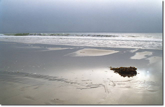 It is late fall and very low tide. The sun breaks through the mist that locals know as "the marine layer". The lighting is a steel gray. Some kelp from the offshore beds has been washed onto the beach. This picture captures exactly how it looked and felt at this time. |